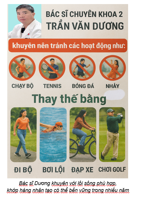 Để bảo vệ khớp háng nhân tạo lâu dài, Bác sĩ Chuyên khoa 2 Trần Văn Dương khuyên bạn nên tránh các hoạt động có tác động mạnh như chạy bộ, tennis, bóng đá, nhảy hoặc các môn thể thao tác động mạnh… Thay vào đó, hãy duy trì các hoạt động nhẹ nhàng như đi bộ, bơi lội, đạp xe, chơi golf, khiêu vũ... Với lối sống phù hợp, khớp háng thay thế có thể bền vững trong nhiều năm.
