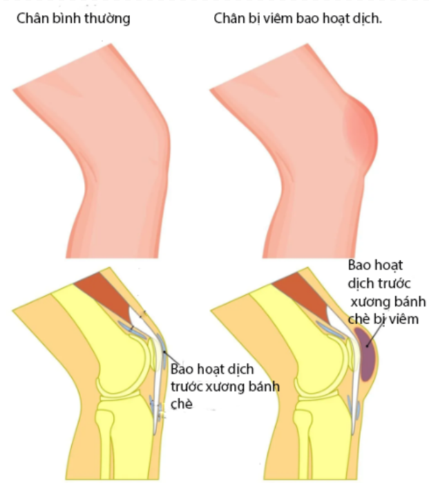 Ở người bình thường, bao hoạt dịch trước xương bánh chè nằm ngay giữa da và xương bánh chè, rất nhỏ, khó thấy bằng mắt thường. Khi bị viêm, bao hoạt dịch sưng lên như một khối phồng, rõ rệt phía trước đầu gối, dễ nhầm lẫn với tụ dịch khớp hoặc u mềm.